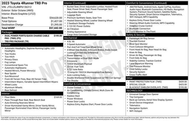 CARFAX One-Owner. Clean CARFAX. 4Runner TRD Pro, 4D Sport Utility, 4.0L V6 DOHC 24V, 5-Speed with ECT, 4WD, Solar Octane, Black/Graphite w/Leather Seat Trim, Black Lug Nuts, Dual Zone Auto Climate Control, Fog Lights, Fox Shocks, Garage Door Opener, Heated Outside Rear-View Mirrors, Moonroof w/Tilt Up & Slide, Multi-Terrain Back Monitor, Roof Rack, TRD Pro All Weather Floor Liner, TRD Pro Badging, TRD Pro Exhaust, TRD Pro Package, TRD Shift Knob, Wheel Locks, 15 Speakers, 3.727 Axle Ratio, 4-Wheel Disc Brakes, ABS brakes, Air Conditioning, Alloy wheels, AM/FM radio: SiriusXM, Anti-whiplash front head restraints, Apple CarPlay/Android Auto, Auto High-beam Headlights, Auto-dimming Rear-View mirror, Automatic temperature control, Brake assist, Bumpers: body-color, Compass, Driver door bin, Driver vanity mirror, Dual front impact airbags, Dual front side impact airbags, Electronic Stability Control, Emergency communication system: Safety Connect (1-year trial), Front anti-roll bar, Front Bucket Seats, Front Center Armrest, Front dual zone A/C, Front fog lights, Front reading lights, Front wheel independent suspension, Garage door transmitter: HomeLink, Heated door mirrors, Heated Front Bucket Seats, Heated front seats, Illuminated entry, Knee airbag, Leather Shift Knob, Low tire pressure warning, Navigation System, Occupant sensing airbag, Outside temperature display, Overhead airbag, Overhead console, Panic alarm, Passenger door bin, Passenger vanity mirror, Power door mirrors, Power driver seat, Power moonroof, Power passenger seat, Power steering, Power windows, Radio: Premium Audio w/JBL, Rear anti-roll bar, Rear seat center armrest, Rear window defroster, Rear window wiper, Remote keyless entry, Roof rack, Security system, SofTex Seat Trim, Speed control, Speed-sensing steering, Split folding rear seat, Spoiler, Steering wheel mounted audio controls, Tachometer, Telescoping steering wheel, Tilt steering wheel, Traction control, Trip computer, Variably intermittent wipers, Wheels: 17 Matte Black Flow-Formed TRD Alloy, 4Runner TRD Pro, 4D Sport Utility, 4.0L V6 DOHC 24V, 5-Speed with ECT, 4WD, Solar Octane, Black/Graphite w/Leather Seat Trim, Black Lug Nuts, Dual Zone Auto Climate Control, Fog Lights, Fox Shocks, Garage Door Opener, Heated Outside Rear-View Mirrors, Moonroof w/Tilt Up & Slide, Multi-Terrain Back Monitor, Roof Rack, TRD Pro All Weather Floor Liner, TRD Pro Badging, TRD Pro Exhaust, TRD Pro Package, TRD Shift Knob, Wheel Locks.